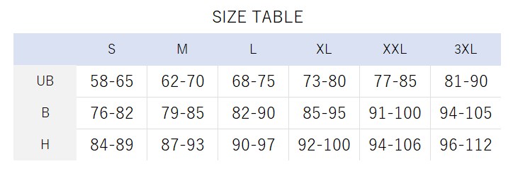 下記サイズテーブルをご参照ください。